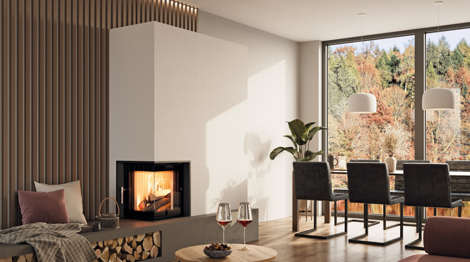 Für ein besonderes Feuererlebnis und hohe Wärmeleistung mit we- nig Platzbedarf hat Leda den kompakten Kachelofen-Heizeinsatz „Bena“ entwickelt. Er vereint dezente Optik mit beeindruckender Heizleistung. Die platzsparende Ecksicht sorgt für architektonische Raumintegration, während der große Feuerraum Scheite bis 50 Zentimeter Länge aufnimmt – ideal für alle, die ihr Holz selbst verarbeiten. Mit 15 Kilowatt zeigt der „Bena“, wie viel Heizkraft in kompakter Form stecken kann – perfekt für alle, die es effizient und leistungsstark mögen. Die erzeugte Wärme kann wahlweise in keramischen Nachheizflächen oder einem hochwertigen Guss-Nachheizkasten gespeichert werden – für lang anhaltenden Heizkomfort.
