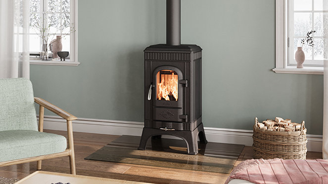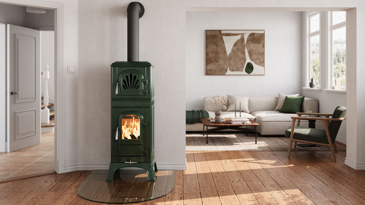 Das Design des „Edda“ verbindet retro-inspirierte Elemente mit modernem Charme und verleiht dem Ofen einen einzigartigen Charakter. Die markante, oben gerundete Sichtscheibe eröffnet den Blick aufs Feuer und schafft ein faszinierendes Flammenspiel. Ein überraschendes Detail: Die stilisierten Standfüße, die dem gusseisernen Ofen eine besondere Präsenz im Raum verleihen – fest verwurzelt, elegant und eigenständig. Mit seiner klassischen Silhouette, verchromten Bedienelementen und wählbaren Oberflächen – mattschwarz lackiert, glänzend dunkelgrün oder petrolblau emailliert – ist er mehr als ein Ofen: ein stilvolles Möbelstück zum Wohlfühlen.