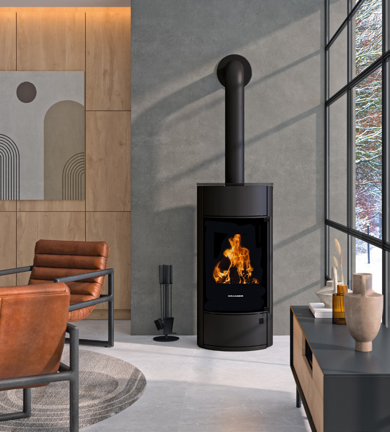 Das „pureBLACK“-Effektglas verleiht dem Kamin zwei faszinierende Gesichter: Im kalten Zustand bleibt die halbtransparente Sichtscheibe schwarz und bildet eine Einheit mit dem Ofen – ohne Einblick in den Brennraum. Ist das Feuer entfacht, entsteht ein intensives Flammenspiel mit klar konturierten Lichtverläufen, das sich eindrucksvoll von der dunklen Umgebung abhebt. Erlischt das Feuer, bleibt die Asche hinter der Scheibe für das Auge verborgen.